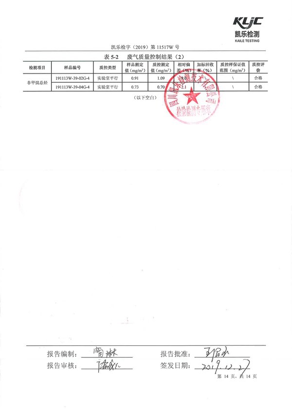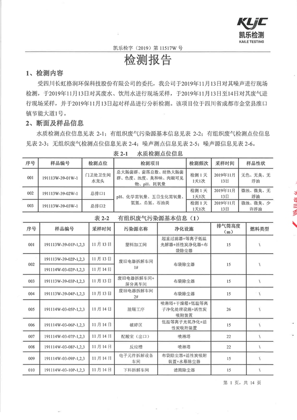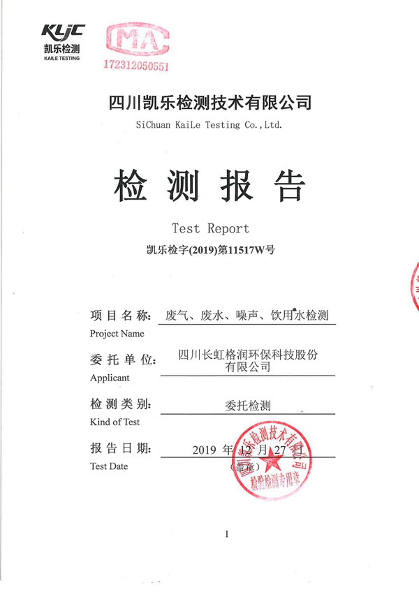 凱樂檢字(2019)第11517W號四川長虹格潤環(huán)??萍脊煞萦邢薰荆◤U氣、廢水、噪聲、飲用水檢測)