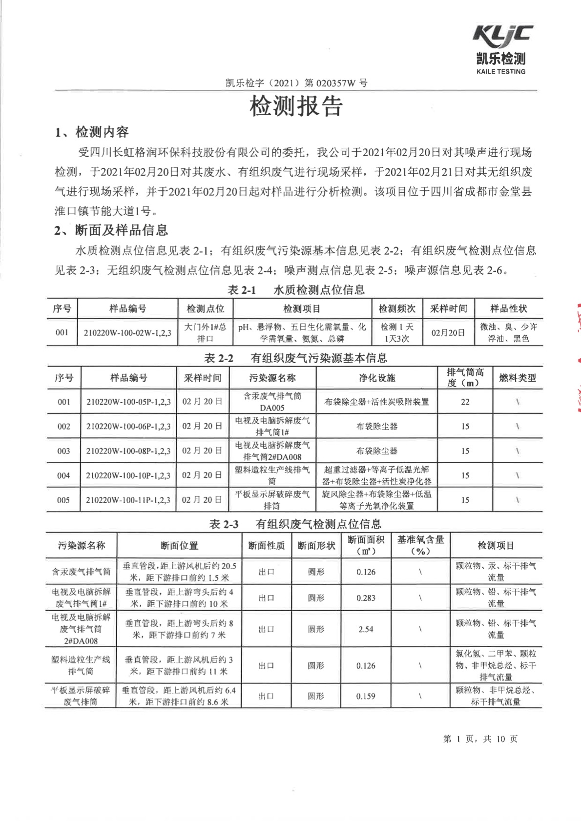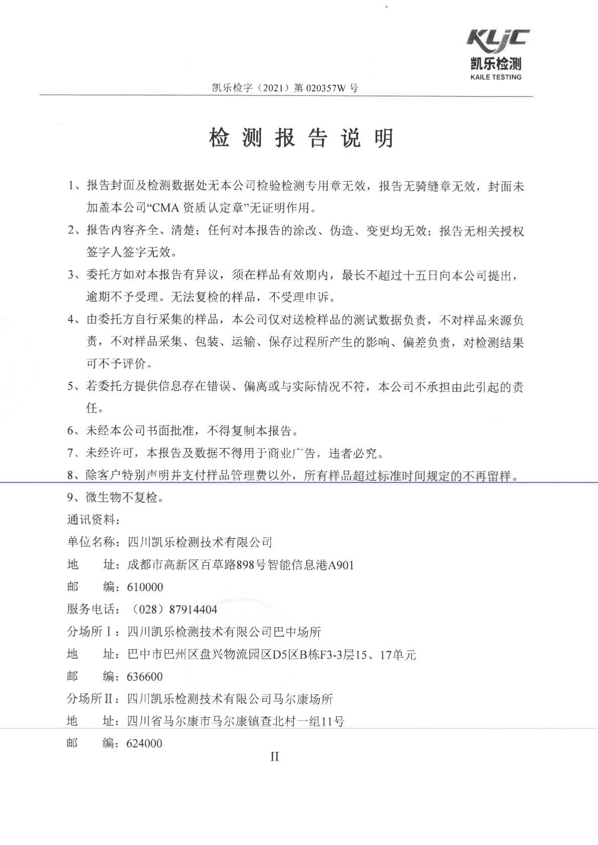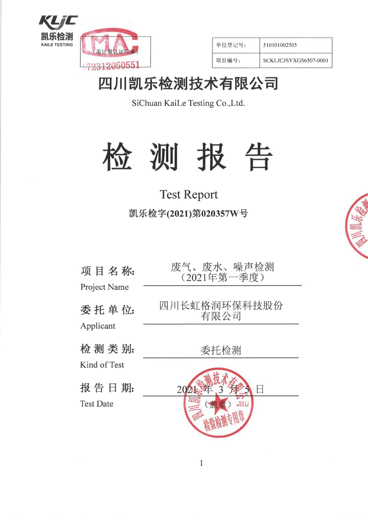 長虹格潤第1季度檢測報告 凱樂檢字(2021)第020357W號