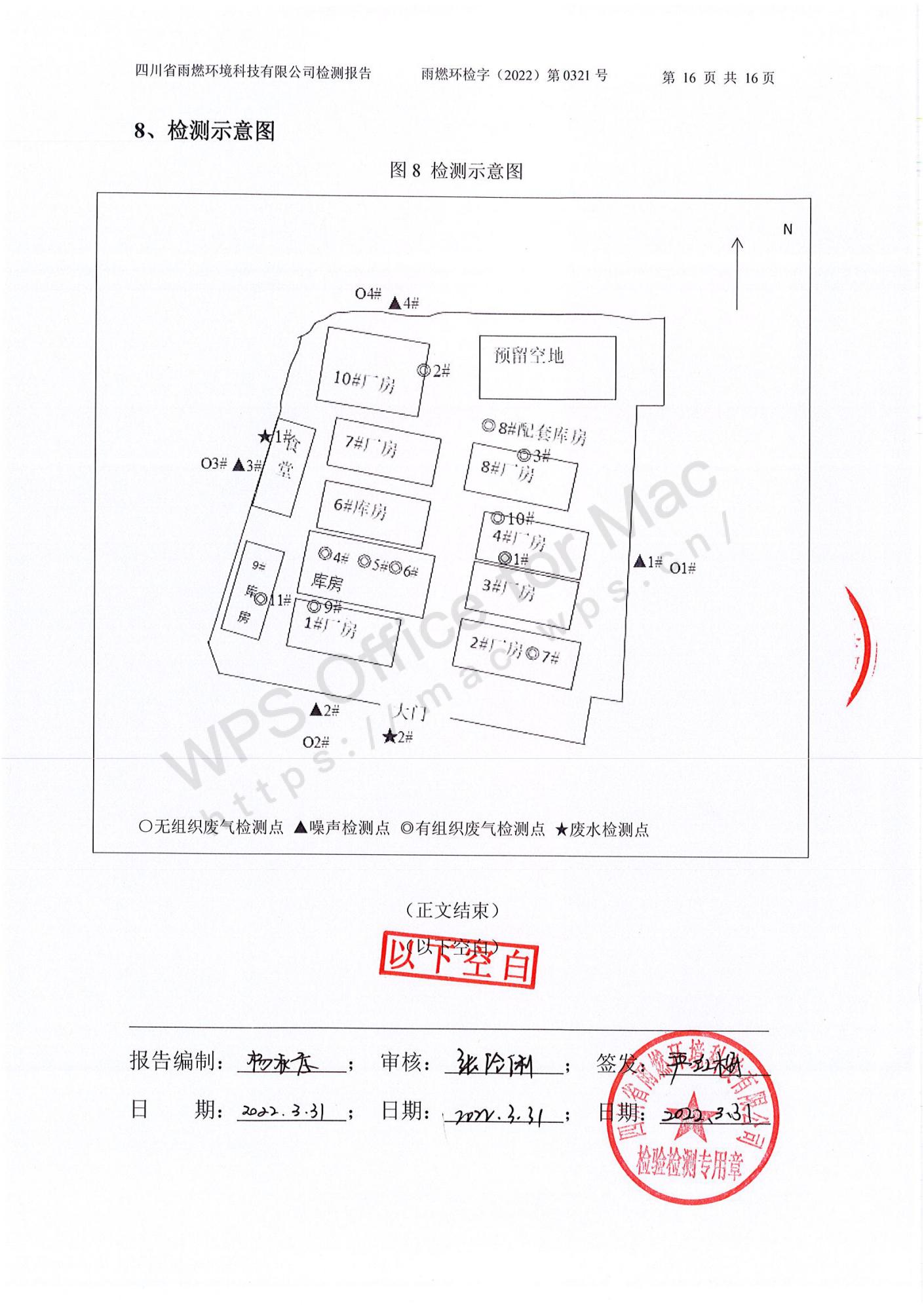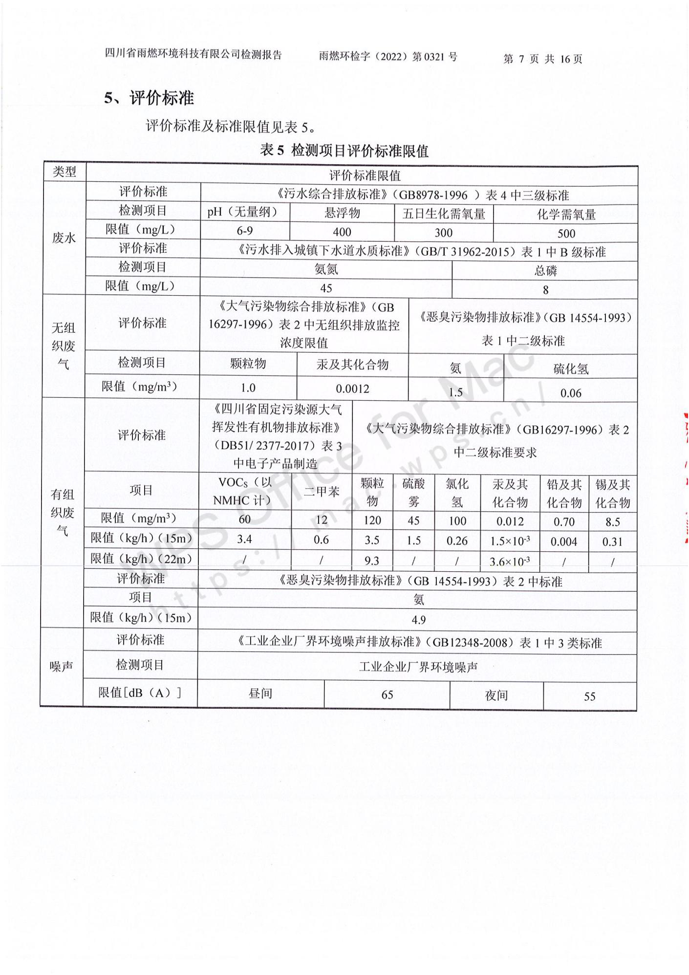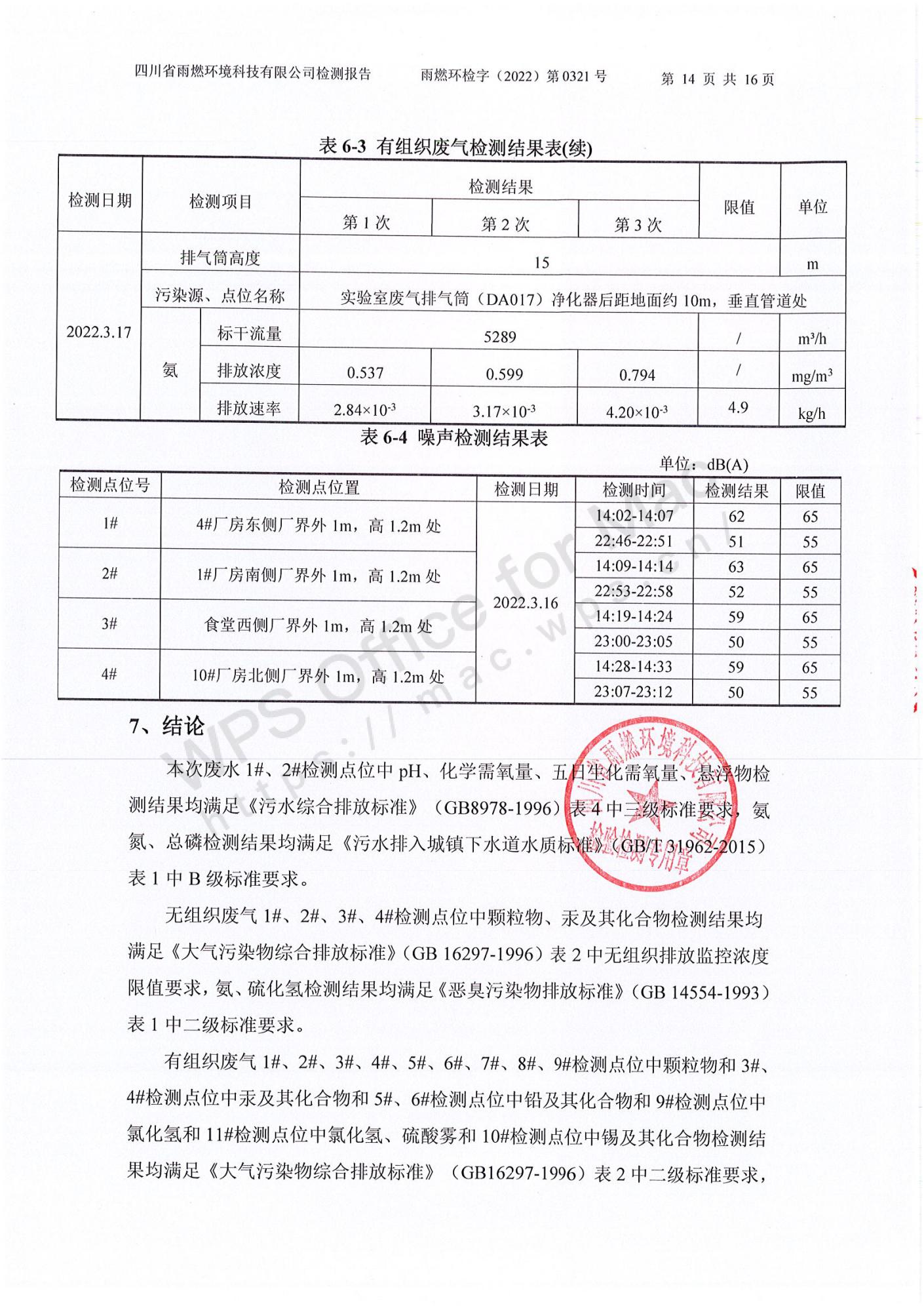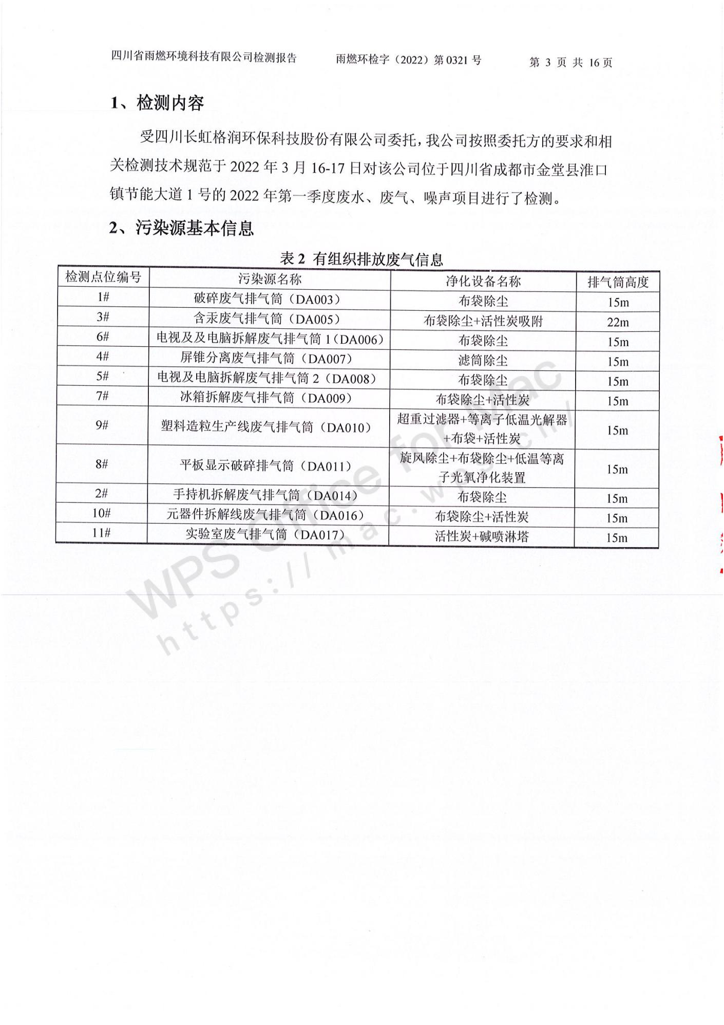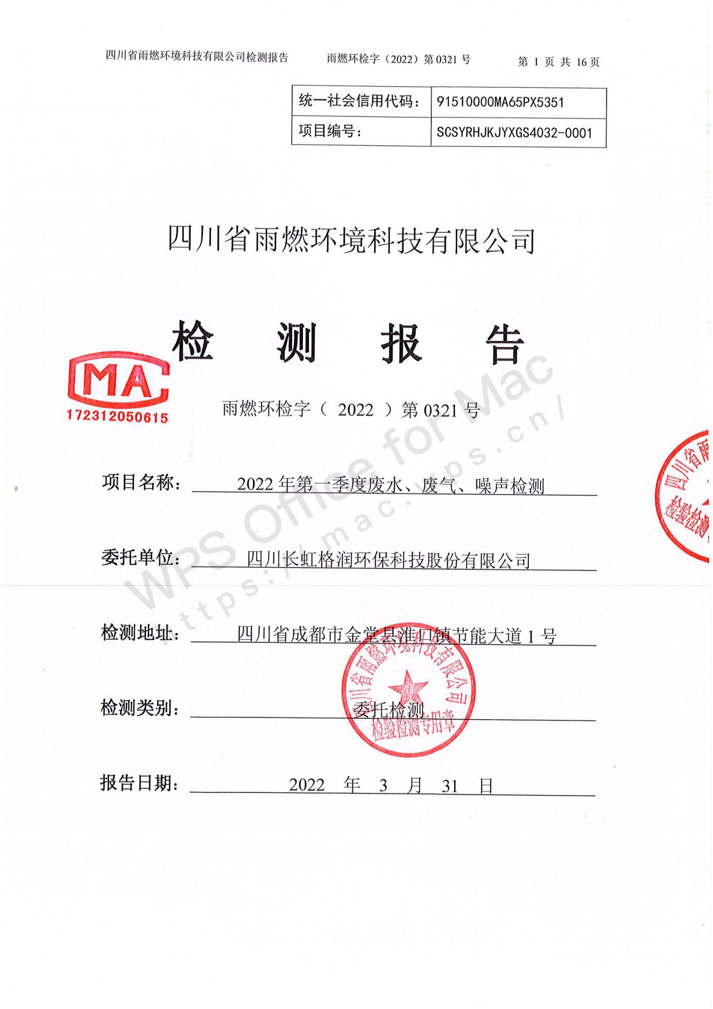 雨燃環(huán)檢字(2022)第0321號四川長虹格潤環(huán)保科技股份有限公司2022第一季度廢水、廢氣、噪聲檢測