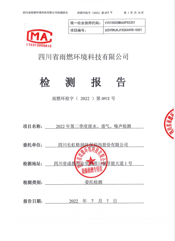 四川長虹格潤環(huán)保科技股份有限公司第二季度檢測報(bào)告-雨燃環(huán)檢字(2022)第0911號(hào))