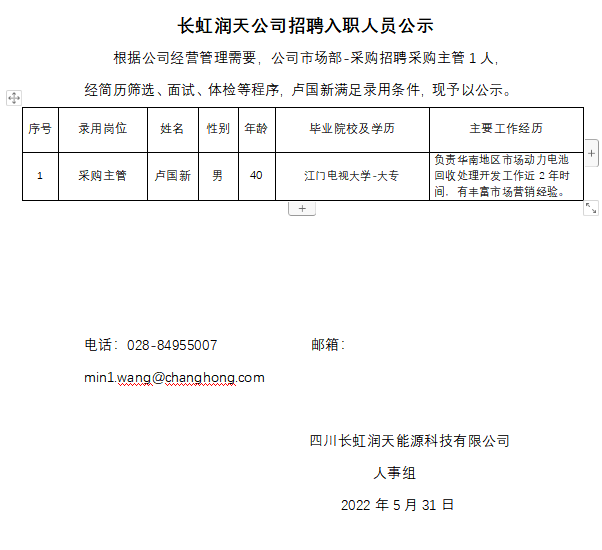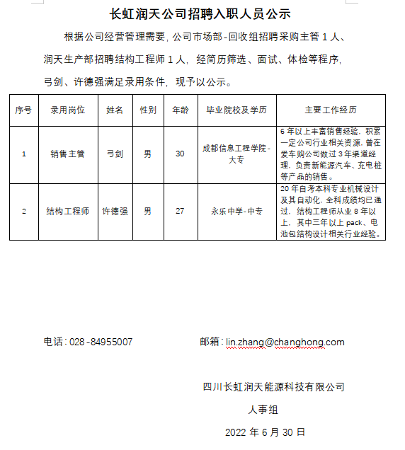 四川長虹潤天能源科技有限公司招聘入職人員公示