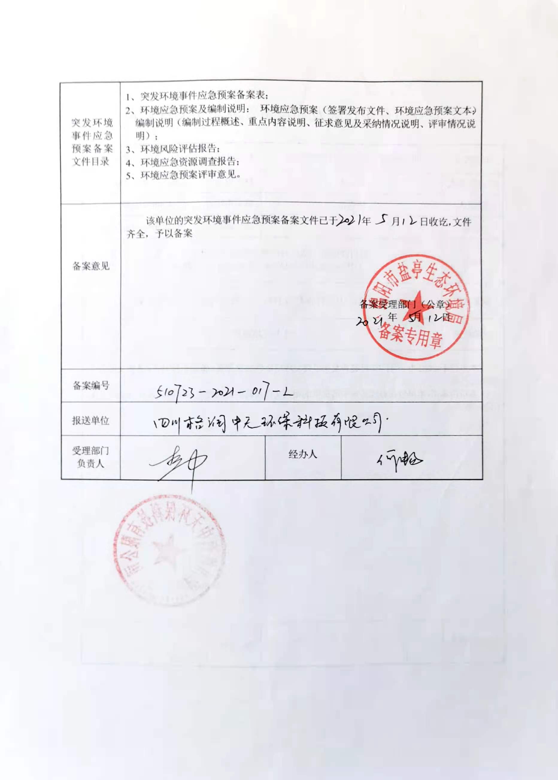 四川格潤中天環(huán)??萍加邢薰緫?yīng)急預(yù)案備案表